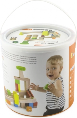 In de verpakking zit een praktische emmer met handvat voor handig opbergen en meenemen. De onderdelen zijn gemaakt van hoogwaardig gelakt hout en gekleurd met niet-giftige verven in opvallende tinten. Het speelgoed stimuleert de fijne motoriek, ruimtelijk inzicht, logisch denken en bevordert de creativiteit.
