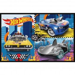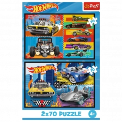 Puzzel 2x70 Hot Wheels zijn twee legpuzzels met afbeeldingen van auto's in één verpakking, ideaal voor gezamenlijke kindervermaak.