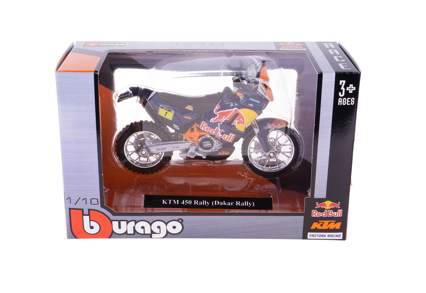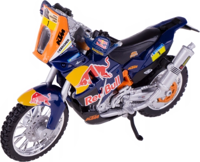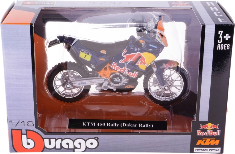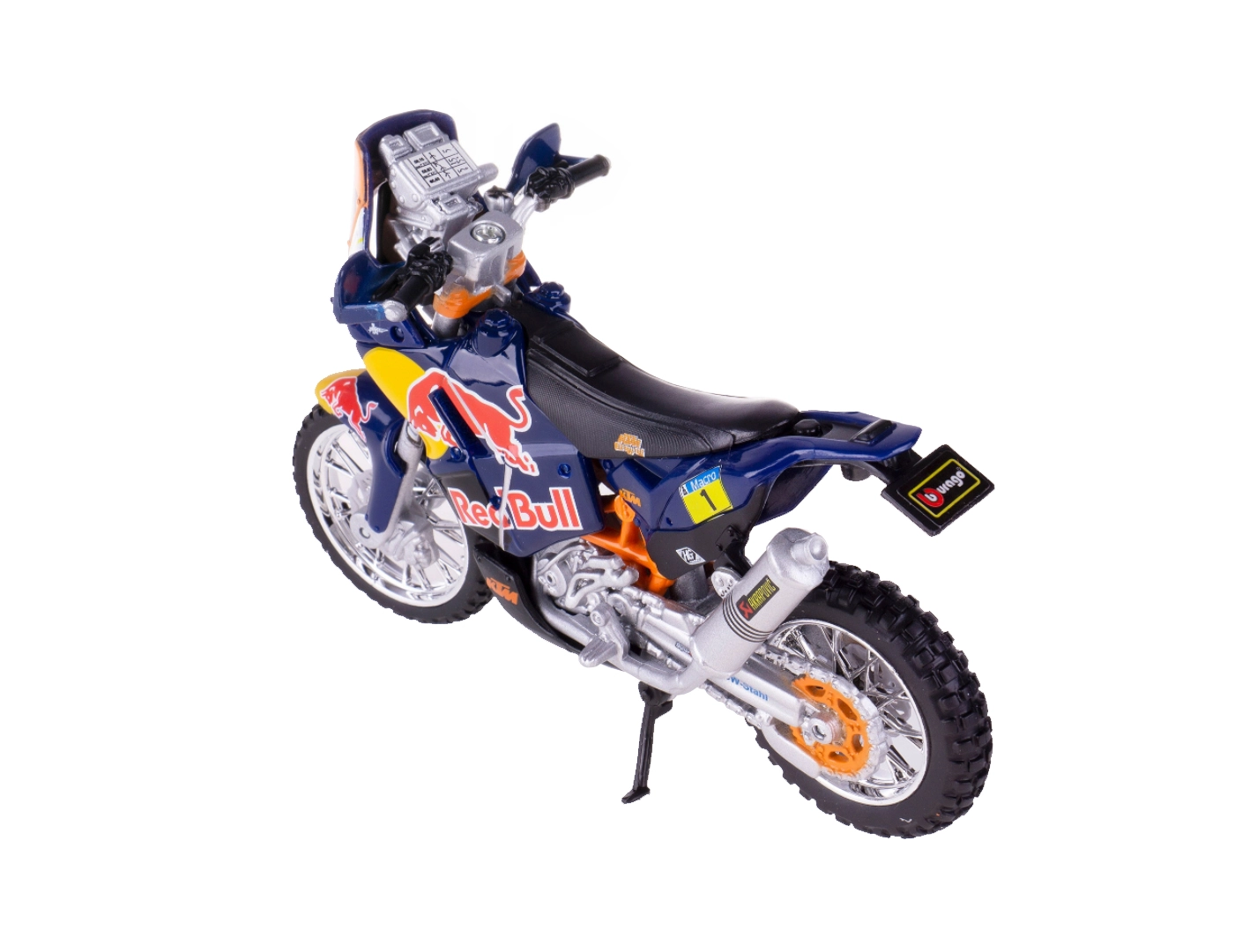 Ontdek de precieze replica van de race-special Red Bull KTM Factory Racing voor de legendarische Dakar Rally. Het model van Bburago op schaal 1:18 valt op door de hoogwaardige metalen body, verfijnde kunststof details en het authentieke teamkleurenschema.