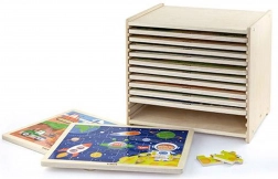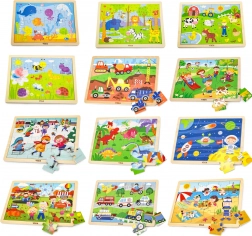 De houten puzzelset van Viga is een ideale keuze voor de eerste systematische puzzelervaring. Elk van de 12 borden heeft een frame met 24 stevige stukjes die perfect passen en prettig in kinderhanden liggen. Eenvoudige vormen, vrolijke afbeeldingen en levendige kleuren zorgen voor speelplezier en een geleidelijke ontwikkeling van vaardigheden.