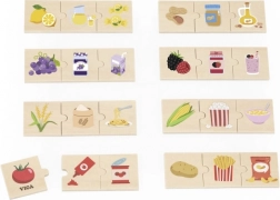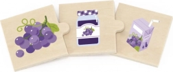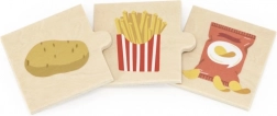 Deze kwalitatieve houten set bevat eenvoudige puzzels die de grondstof koppelen aan het bewerkte product. Kinderen leren op een speelse manier waar hun favoriete lekkernijen vandaan komen – bijvoorbeeld aardappel en frieten, citroen en limonade, maïs en popcorn of druiven en druivenjam/sap.