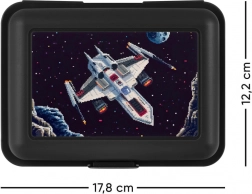 De plastic doos heeft een aantrekkelijk ontwerp met een ruimteschip en sterren die iedereen zal aanspreken.