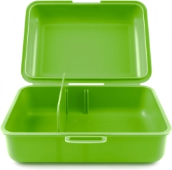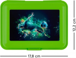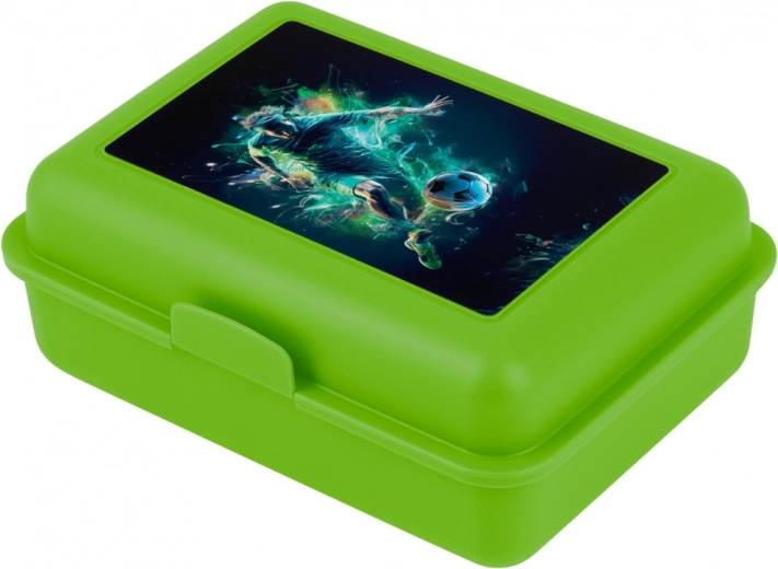 Praktische groene lunchbox met afbeelding van voetballer, ideaal voor schoollunches of picknicks. Bevat een scheidingswand en vergrendeling voor veilig afsluiten.