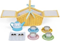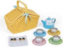 Deze picknickset bevat 18 stuks servies, waaronder een theepot, kopjes, bordjes en lepeltjes, voor een complete uitrusting voor kleine picknickliefhebbers.