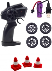 De auto is uitgerust met vierwielaandrijving (4WD), wat zorgt voor uitstekende grip en stabiliteit, zelfs bij dynamische manoeuvres. De 2,4 GHz afstandsbediening garandeert vloeiende besturing zonder interferentie en maakt controle over het voertuig op grotere afstand mogelijk. Bij de set zijn extra driftbanden inbegrepen, die het uitvoeren van gecontroleerde slippartijen vergemakkelijken. Er worden ook pionnen meegeleverd, waarmee je je eigen parcours kunt creëren en je rijtechniek kunt verbeteren.