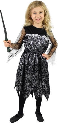 Magisch carnavalskostuum voor kleine heksen! Dit indrukwekkende zwarte kostuum met een spinnenwebpatroon betovert gegarandeerd op carnaval en Halloween. Meer tonen