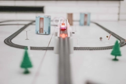 - modellen van woonhuizen, spoorbomen, boompjes en lampen