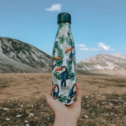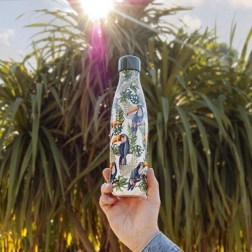 Levendige kleuren en een motief van tropische bladeren met een toekan maken van de thermosfles een opvallende accessoire voor onderweg, naar het werk en naar school.