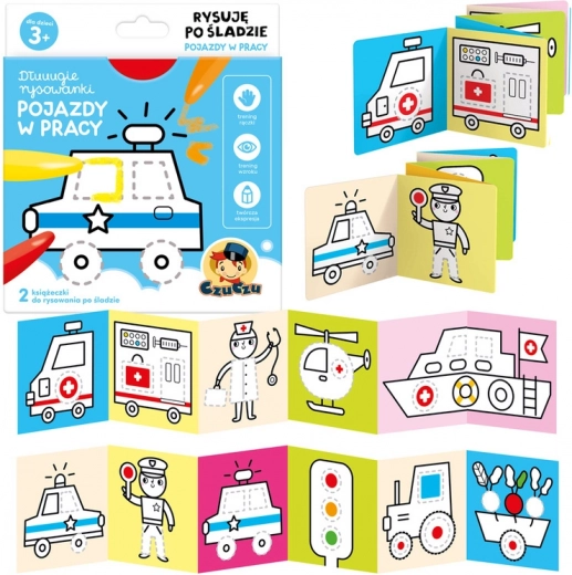 Stap in de wereld van creativiteit met onze creatieve set met twee lange harmonica-boekjes vol kleurrijke voertuigen. Deze doorlopende illustraties zijn perfect voor jonge kunstenaars met een passie voor tekenen en schilderen.