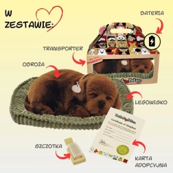 De zachte chocoladekleurige labrador oogt bijzonder realistisch – gesloten ogen, een zachte vacht, een halsband met label en een comfortabel mandje geven de indruk van een echt slapende pup. Het speelgoed ondersteunt een rustige sfeer in huis en in de kinderkamer en maakt zowel jonge als volwassen hondenliefhebbers blij.