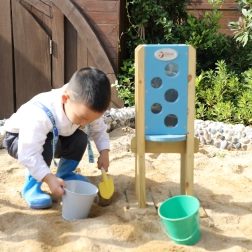 Dit houten zandpaneel is ontworpen voor natuurlijk experimenteren met zand. Kinderen kunnen het bovenste gedeelte vullen en door het vrijlaten via de onderste stop zien hoe het zand door verschillende openingen in het paneel stroomt. Zo ontwikkelen ze oog-handcoördinatie, zintuiglijke waarneming en leren ze de basis van oorzaak en gevolg.