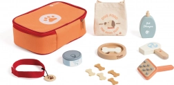 Inhoud van de set (15 onderdelen): draagtas, halsband, bot, bakje, blikje voer, zakje voer, huisdiershampoo, vachtborstel, föhn, schaar en overige kleine accessoires.