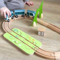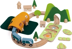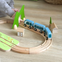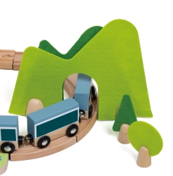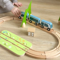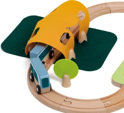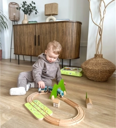 Onderdelen kunnen creatief gecombineerd worden – houten blokken zijn stapelbaar en vormen huisjes rond de rails. Hoogwaardige natuurlijke materialen (hout met FSC-certificering, vilt van gerecycled P.E.T.) zijn duurzaam, aangenaam om aan te raken en milieuvriendelijk. Ideaal voor zelfstandig spelen én samen ontdekken.