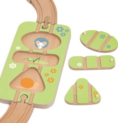 De vormpuzzel sluit aan op de rails; kinderen zoeken de juiste stukjes aan de hand van dieren en bloemen en trainen zo hun logisch denken en geduld.