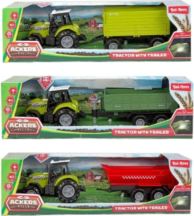 Plastic tractor met aanhanger met vrije loop met licht en geluid. Ideaal speelgoed voor kinderen vanaf 3 jaar, stimuleert fantasie en motoriek. 3 soorten, verpakking 29×9×8 cm.