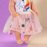 Geef je pop een magische stijl met het unieke tutu jurkje met eenhoornthema. De set bestaat uit een wit T-shirt met korte mouwen en een speelse eenhoornprint, gecombineerd met een roze tutu-rok van tule met echte kleurrijke pompons onder de bovenlaag. De combinatie van zachte materialen en een elastische taille maakt het aankleden eenvoudig en comfortabel tijdens het spelen.