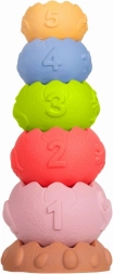De pastelkleurige onderdelen zijn gemakkelijk vast te pakken en stapelen stabiel tot een hoge toren. Kinderen oefenen oog-handcoördinatie en geduld bij elke gebouwde piramide.
