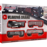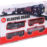 Compleet set voor kleine machinisten: een kunststof treintje met locomotief en 3 wagonnetjes op batterijen met licht en geluid. Eenvoudige montage van rails 104 × 68 cm, geschikt vanaf 3 jaar.