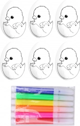 Ontdek leuk paas-knutselwerk met een set die 6 polystyreen eieren met een kuikentje-in-ei patroon en 6 stiften in levendige kleuren bevat. Het gladde, witte oppervlak van de eieren is ideaal om te schilderen, schrijven en versieringen te plakken. Perfect voor familieworkshops, peuterspeelzalen en scholen.