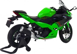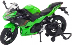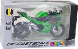 Het metalen model van de sportmotor is voorzien van realistische elementen zoals een draaibaar stuur, geveerde ophanging en draaiende wielen, waardoor echte ritten en manoeuvreren kunnen worden gesimuleerd. De details van de motor, inclusief het aerodynamische ontwerp en de groene kleur geïnspireerd op klassieke racemodellen, geven het model een authentiek karakter.