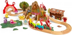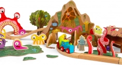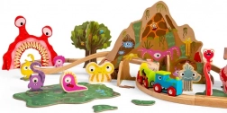Complete set met locomotief, 2 wagonnetjes, brug, tunnel en grappige monstertjes voor uren creatief bouwen en spelen.