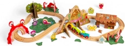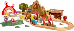Locomotief, 2 wagonnetjes, rails, brug, tunnel, monsterfiguren, boom met dieren, moeras, hut en accessoires