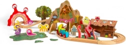 • 50 onderdelen: locomotief, 2 wagonnetjes, rails, brug, tunnel, monsters, boom met dieren, moeras, hut en extra accessoires.