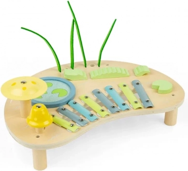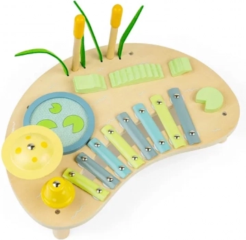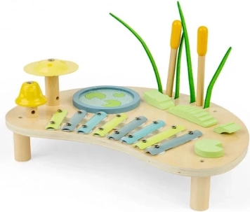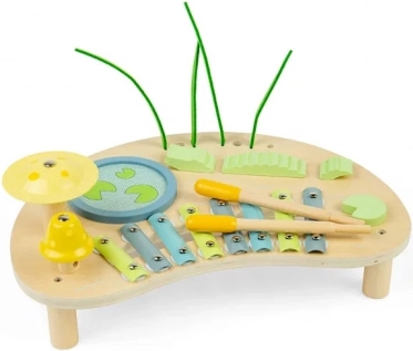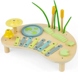 Inbegrepen zijn ingebouwde instrumenten: een xilofoon met metalen lamellen, een trommel in de vorm van een vijver, een paar belletjes en ritmische elementen die aan een krokodil doen denken. Twee houten stokjes vergemakkelijken het spelen en moedigen kinderen aan te experimenteren met ritme en tempo. Het product is verantwoord vervaardigd van FSC-hout en afgewerkt met niet-giftige verven.