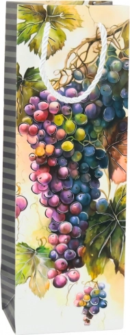 Kleurrijke motieven met wijnflessen en druiven geven de tas een elegante uitstraling.