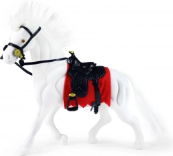 Het paard is uitgerust met een zadel en hoofdstel, zodat kinderen echte ruiters kunnen naspelen en hun eigen verhalen kunnen verzinnen.