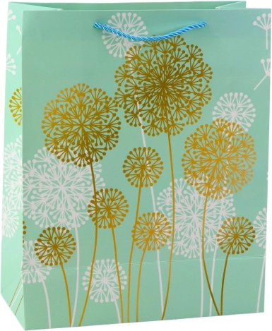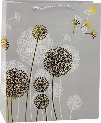 Deze stijlvolle papieren tas met een subtiel natuurlijk paardenbloemmotief en gouden en witte accenten geeft je cadeau een luxueuze uitstraling. Geschikt voor verjaardagen, jubilea, bruiloften en familiefeesten en past perfect bij moderne decoratieve trends.