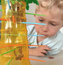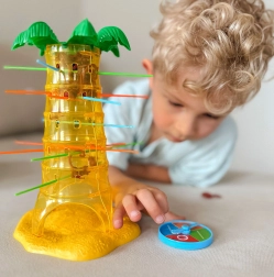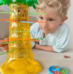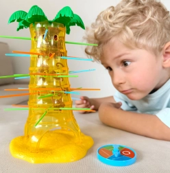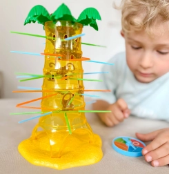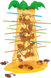 In dit geweldige spel van het merk Woopie steek je stokjes in de gaten van de palmboom en gooi je aapjes erop. Bij elke beurt draai je aan het wiel en de pijl bepaalt welk stokje je moet uittrekken. Het doel is om de aapjes zo lang mogelijk in de boom te houden en niet te laten vallen. De winnaar is degene die de minste aapjes laat vallen.