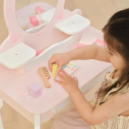 De praktische lade en zijplankjes bergen alle schatten op. Inclusief een uitgebreide set houten accessoires: palet met kwastje, lippenstift, nagellakken, parfum, kam, zachte poederkwast en föhn. Het speelgoed heeft gladde randen en een afwerking met niet‑giftige verven voor veilig spelen.