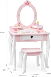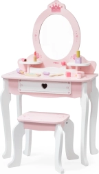 Een betoverende houten kinderkaptafel in roze‑wit van Viga tovert elke kamer om tot een klein koninkrijk. Voorzien van een veilig spiegel met kroontje, een comfortabel krukje, een ruime lade en een set houten cosmetische accessoires. Dankzij de hoogwaardige afwerking, gladde randen en niet‑giftige verven is het ideaal voor creatieve en rollenspellen van kinderen.