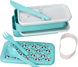 Schattige lunchbox met pandamotief en een inhoud van 1,2 l, ideaal voor lunches naar school, werk en onderweg. Biedt twee gescheiden lagen, een praktische bestekset met vork, mes en lepel en een veilige bevestiging met elastische band. Geschikt voor de vriezer en voor opwarmen in de magnetron zonder deksel (max. 100 °C).