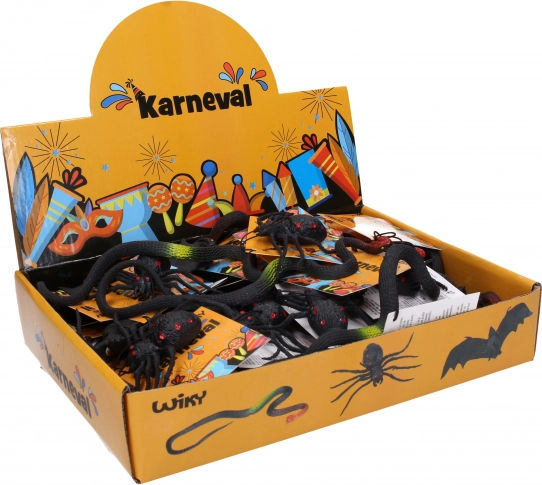 Leuke mix van rubberen speelgoedjes met motieven van slang, vleermuis en spin in een praktische displaydoos. De verpakking bevat 50 stuks zachte en flexibele figuurtjes – ideaal als kleine beloning, voor in goodiebags en voor Halloween-decoraties en spelletjes.