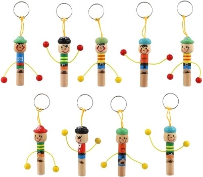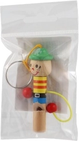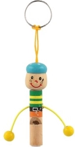 Houten sleutelhanger mannetje met fluitje 8 cm, mix varianten