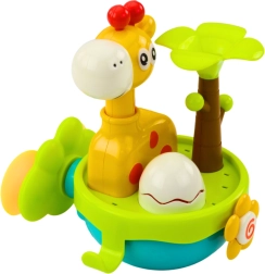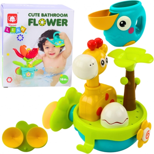 De set bevat een schattige giraffe met beweegbare delen, een kleurrijke palmboom, bloemen en kleurrijke waterrotoren. Er is ook een handige beker met schenktuit, waarmee het speeltje met water overgoten kan worden. Wanneer het kind water op de aangewezen plekken giet, komt het speeltje tot leven - delen beginnen te draaien, bloemen bewegen en water stroomt, wat de aandacht trekt en veel vreugde brengt.