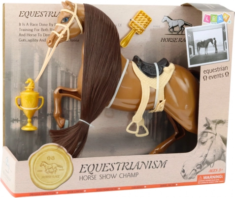Bruin paard met lange manen en accessoires, ideale set voor kinderen die van dieren houden. Inclusief zadel, hoofdstel, borstel en trofee.