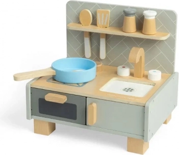 Kleine draagbare kitchenette voor kleine chef-koks, met een gootsteen, kast, kookplaat en oven, inclusief veel accessoires zoals een pan, spiegelei, keukengerei en kruiden.
