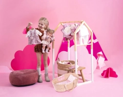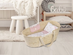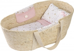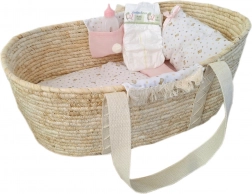 Dit prachtige Mozesmandje is uitgerust met stoffen zakjes aan beide zijden en bevat een decoratief dekentje, een kussen en een matras. Het is geschikt voor poppen van 40-45 cm, maar dient ook uitstekend als opbergruimte voor andere speelgoedjes, zoals knuffels.
