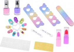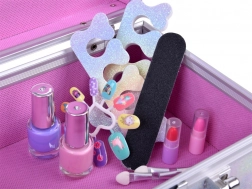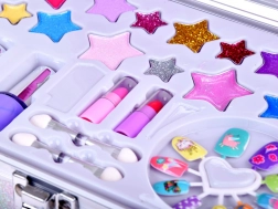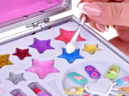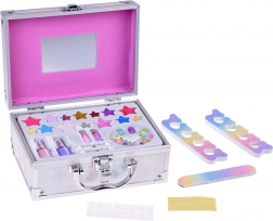 Het koffertje bevat alles wat je nodig hebt voor leuk opmaken: nagellak, lippenstift, oogschaduw, applicators, plaknagels en stickers. Voor extra gemak zit er binnenin ook een spiegeltje.
