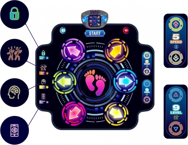 Functionaliteit van de dansmodus: Negen niveaus van verschillende moeilijkheid, waarbij het doel is om op de verlichte punten op de mat te stappen. Voor correcte bewegingen verdien je punten en ga je door naar hogere niveaus.