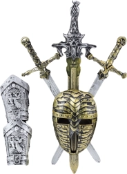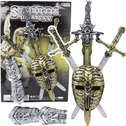 Met deze ridderset kunnen kinderen dappere strijders worden. Dankzij het gestileerde masker krijgen ze een ridderlijke uitstraling en voelen ze zich als in de middeleeuwen. De set bevat drie zwaarden van verschillende lengtes, een decoratief masker en twee polsbeschermers, die het geheel een realistische ridderstijl geven.