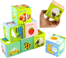 De blokken bevatten verschillende afbeeldingen – letters, cijfers of woorden in het Engels – wat de taal- en cognitieve ontwikkeling van het kind ondersteunt. Elke kubus is ontworpen om zintuiglijke stimulatie en de ontwikkeling van de fijne motoriek te bevorderen, waardoor kinderen de blokken kunnen stapelen, knijpen, gooien en verschillende patronen en kleuren kunnen ontdekken.