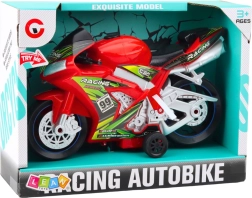De rode motor is gemaakt van hoogwaardig kunststof dat bestand is tegen schade en is voorzien van stevige brede wielen en een stabiele steun die veilig en comfortabel spel op verschillende oppervlakken garandeert. Licht- en geluidseffecten, die worden geactiveerd door een knop in te drukken, bieden realistische motorgeluiden en lichteffecten, wat het spel nog aantrekkelijker maakt.