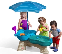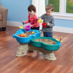 Deze tafel bevat veel speelaccessoires, waaronder een zeef, springplanken voor in het water, drie bekers, vier figuren en een water spinner in de vorm van een zeester. Het bovenste waterreservoir heeft een inhoud van 7,57 liter en het onderste 11,30 liter. Het productontwerp zorgt voor eenvoudige montage en stabiliteit.