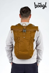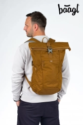 Stijlvolle rolltop rugzak BAAGL in karamelkleur: licht, duurzaam en ideaal voor in de stad, naar school en voor uitstapjes. Biedt een inhoud van 29 l, draagvermogen 7 kg, een gepolsterd laptopvak en sneldrogend waterafstotend materiaal met hoogwaardige YKK-ritsen. Ergonomisch gevormde rug en ondersteunende banden zorgen voor comfort, ook bij langer dragen. De GRS-certificering bevestigt de duurzame herkomst van de materialen.