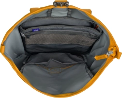 Binnenin vind je een overzichtelijk ingedeelde ruimte met een inhoud van 29 l en een afzonderlijk gevoerd laptopvak met eigen zij-ingang met rits voor snelle toegang. Het oprolbare bovendeel met gesp maakt het mogelijk de capaciteit aan te passen aan de actuele behoeften en de inhoud veilig afgesloten te houden.