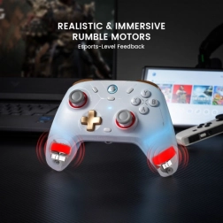 Verbind de controller zoals jij wilt – 2,4 GHz voor minimale latentie, Bluetooth voor snel koppelen of bekabeld voor maximale stabiliteit. Asymmetrische vibratiemotoren zorgen voor realistische haptische feedback en de frontale microknoppen op e-sportniveau garanderen snelle en trefzekere input. Aanpasbare RGB-effecten en snel wisselen van profielen laten je de controller precies afstemmen op jouw game en stijl.